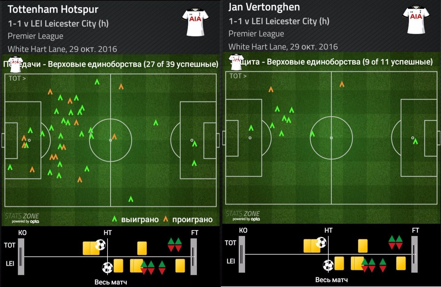 Процент выигранных верховых единоборств «Тоттенхэма». За весь матч «шпоры» выиграли 27 из 39 верховых единоборств, а это целых 69%. Показатель достаточно впечатляющий, особенно учитывая то, что в среднем в футболе выигрывается около 50% «верховых дуэлей», поэтому любая цифра, превышающая это значение, уже является хорошим результатом. Причиной такого успеха «Тоттенхэма» – в чрезмерной склонности «Лестера» к длинным передачам. В этом матче доля лонгболов у «лис» (25%) значительно превзошла средний показатель команды (17%), да и в целом по туру средняя длина передач больше только у «Бёрнли». Однако ни Варди, ни Оказаки никогда особо не преуспевали в верховой борьбе, что вылилось в практически заоблачные цифры для Яна Вертонгена и Виктора Ваньямы: 9 из 11 и 6 из 7 выигранных единоборств соответственно. Вполне возможно, что присутствие на поле физически более сильного Ислама Слимани могло бы улучшить статистику «Лестера».