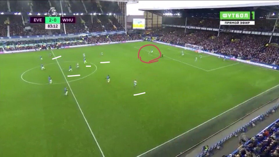 В итоге англичанин оставшийся отрезок матча провёл скорее на позиции правого инсайда, лишь изредка возвращаясь на свою половину. Все бы ничего, команда проигрывает, но такое дворовое поведение стоило «молоткам» гола. Достаточно лишь взглянуть на момент передачи в исполнении Ромелу Лукаку: в своей штрафной как раз оказалась оборонительная пятёрка: Крессуэлл, Нобл, Огбонна, Рид и Куяте (Лансини играл в паре с Ноблом, но Мануэль – игрок сугубо атакующего плана, игравший в центре поля после замены Обианга на Андре Айю и призванный снабжать атакующую троицу передачами), перед штрафной зияет почти что чёрная дыра, и уже потом атакующая тройка (Дзадза, Пайет и Айю), Лансини и Антонио. В итоге совершенно свободного Росса Баркли обязан был прикрывать именно Антонио.