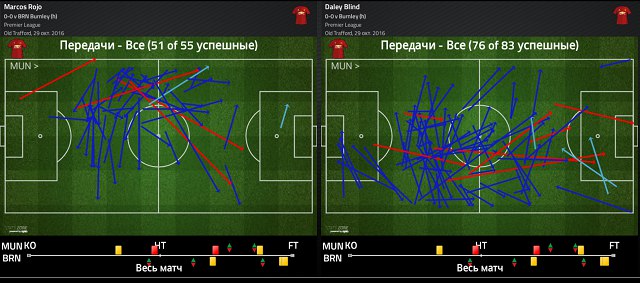 После изучения диаграммы приходит следующее соображение: Блинд, несмотря на то, что был вторым после Погба по числу передач (89 с учетом кроссов), отдавал очень мало передач в высокие зоны на правом фланге. Голландец, получая мяч, был развернут к полю под неудобным углом, поэтому если появлялось малейшие признаки давления со стороны соперника, Дэйли пасовал на левый фланг, либо искал партнеров в позиции между линиями в центре. Блинд не доставлял мяч в высокие зоны на правом фланге – из-за этого Лингард был вынужден уходить в центр или даже на левый фланг, организуя перегрузки, а Дармиан, несмотря на высокую позицию, не получал мячей в достаточной степени.