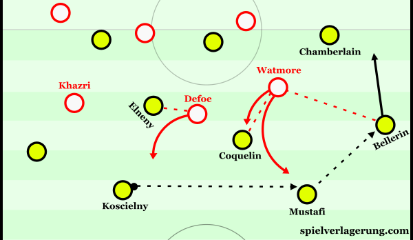 Уотмор выдвигается для поддержки Дефо, Бельерин остается свободным, Ван Анхольт не может отреагировать на это, так как его прямой оппонент, АОЧ, держит широкую позицию, а полузащитникам, в частности, Пиенару не хватает мобильности и слаженности, чтобы перекрыть это направление. В результате, быстрый перевод мяча на Бельерина позволял «Арсеналу» легко разбивать прессинг соперника.