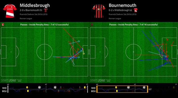 Френд против движения Кинга. Система Каранки предполагает персональную игру фулбеков против вингеров соперников в некоторых зонах, но левый защитник «Мидлсбро» Джордж Френд плохо чувствует такие моменты, как следствие, Джошуа Кинг легко им манипулировал и создавал дыру в обороне. Иногда уводя его ближе к флангу и резко открываясь ему за спину, но чаще уводя его в центр и открывая зону на левом фланге партнерам. Особенно хорошие зону замечал и использовал Джек Уилшер. «Борнмут» легко проникал в штрафную таким образом и создал острые моменты, среди которых был удар в каркас ворот. «Мидлсбро» откровенно повезло не пропустить таким образом.