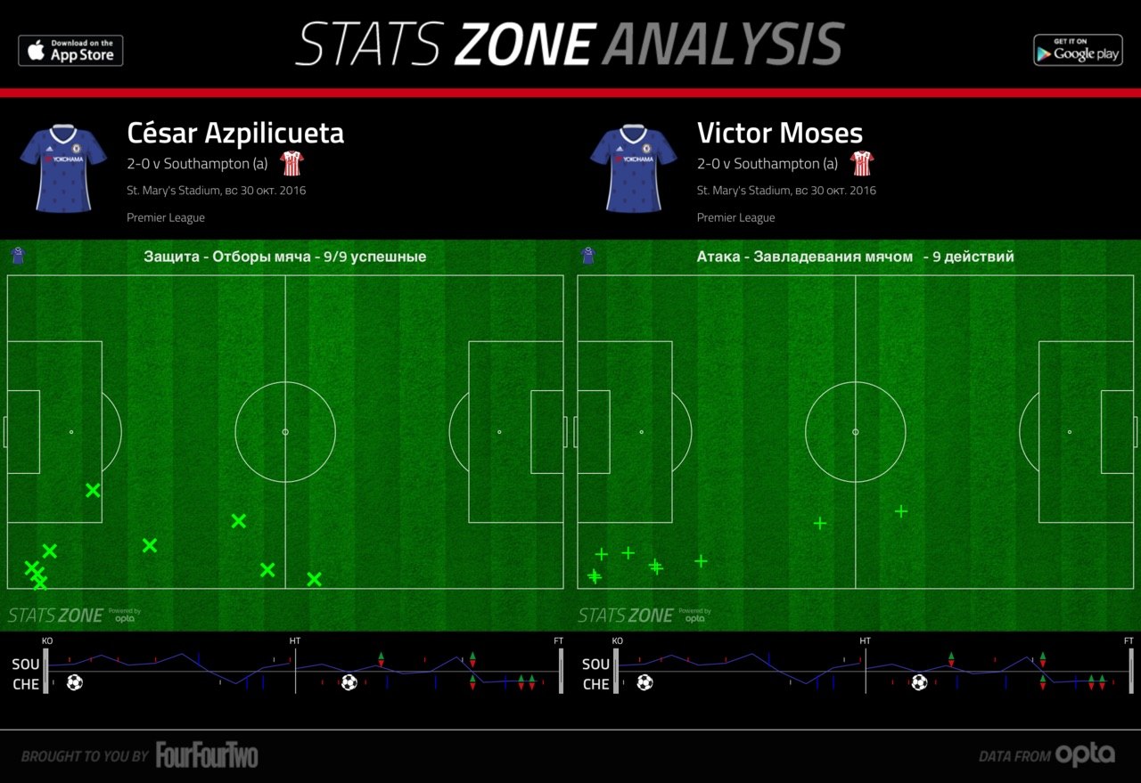 Виктор Мозес и Сесар Аспиликуэта («Челси»). Переход на схему с тремя ЦЗ существенно укрепил игру «синих» в позиционной обороне и неудивительно, что уже который матч кряду команда Антонио Конте выдает блестящий оборонительный перформанс. И если на левом фланге обороны «Челси» соперник все ещё может находить «лазейки» для доставки мяча в штрафную, то правый фланг, благодаря совместным усилиям Мозеса и Аспиликуэты, превратился в непреодолимое препятствие для игроков атакующей команды. Против «Саутгемптона» эта пара на двоих насобирала 12 овладеваний мячом, 12 успешных отборов из 13 попыток и 2 перехвата. Не менее качественную игру они продемонстрировали и туром ранее против «МЮ»: 14 овладеваний, 6/7 успешных отборов и 7 перехватов.
