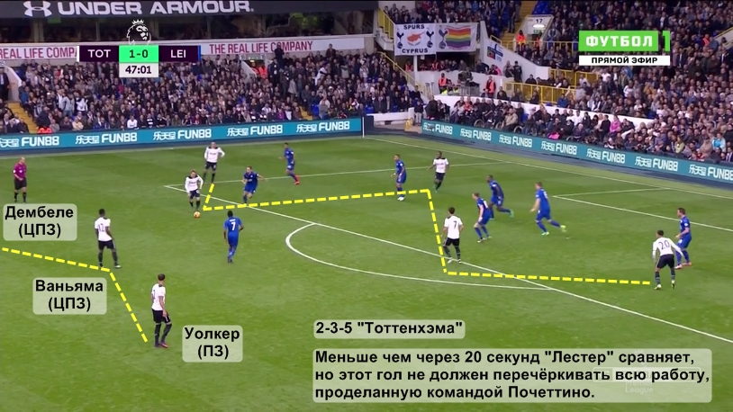 Контратаки «Лестера». «Тоттенхэм» владел мячом большую часть матча (64,1%), поэтому «Лестеру» пришлось делать ставку на контратаки. Несмотря на то, что единственный гол в матче «лисы» забили именно в результате контратаки, нельзя сказать, что «Тоттенхэм» не подготовился к этой особенности соперника. Момент с голом – скорее, нелепая ошибка, чем тактический промах. В целом, «шпоры» отлично справлялись с задачей свести к нулю любые попытки «Лестера» выйти в контратаку, во многом благодаря эффективному применению контрпрессинга.