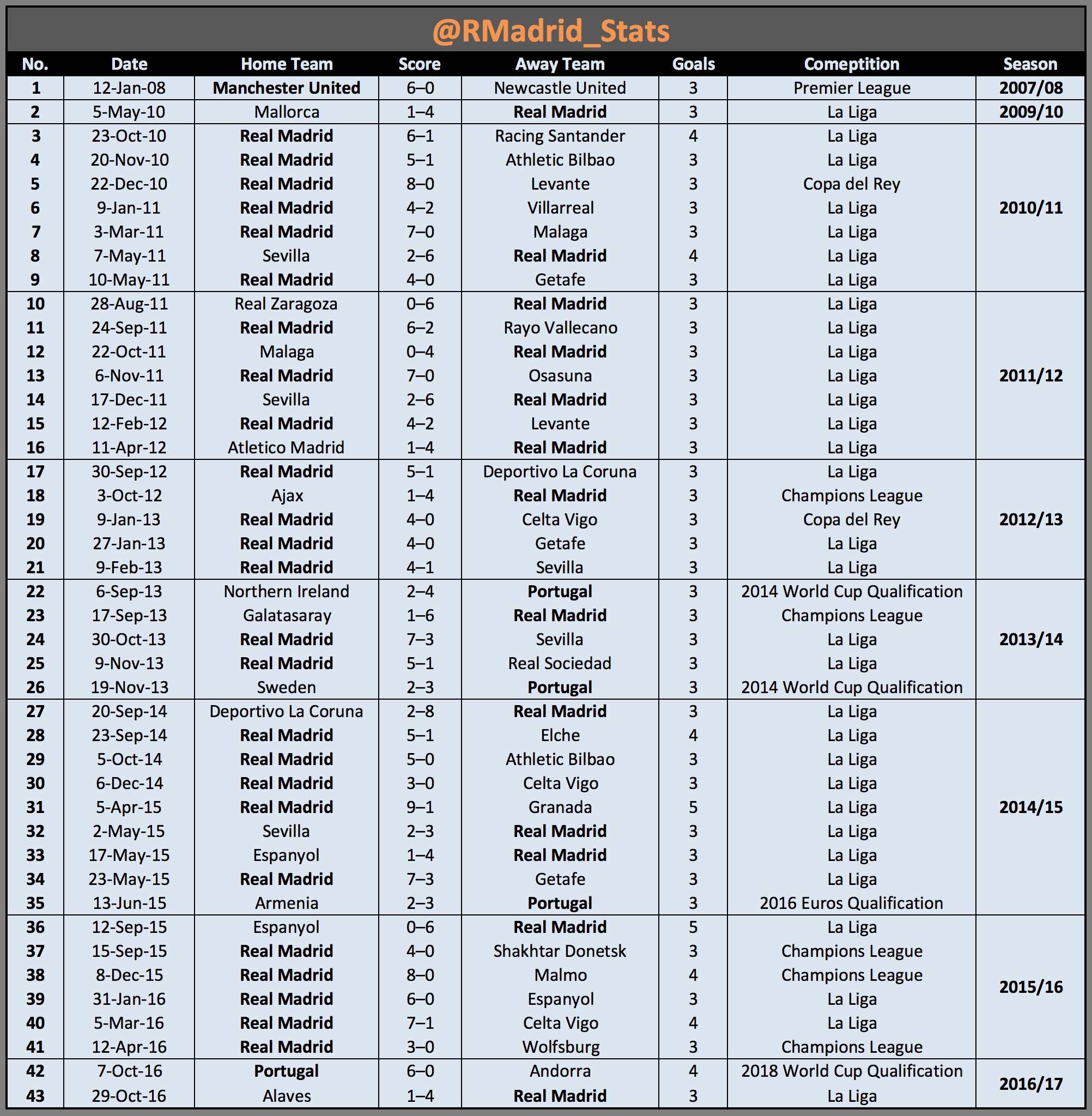 27 ноября 2016, 16:44 Все хет-трики Криштиану Роналду В недавнем матче против «Атлетико» Криштиану Роналду оформил свой 44-й хет-трик в карьере Автор Niko Этот пост опубликован в блоге на Трибуне Sports.ru. Присоединяйтесь к крупнейшему сообществу спортивных болельщиков! Другие посты блога Всё о лучшем клубе мира Сборная Португалии по футболу Лига чемпионов УЕФА Реал Мадрид Ла Лига Криштиану Роналду