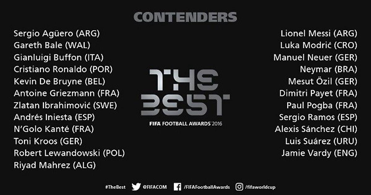 Номинанты ФИФА: Гарет Бэйл, Кевин Де Брёйне, Рияд Марез, Месут Озил, Димитри Пайет, Алексис Санчес, Криштиану Роналду, Луис Суарес, Джейми Варди, Серхио Агуэро, Антуан Гризманн, Златан Ибрагимович, Роберт Левандовски, Лионель Месси, Неймар.