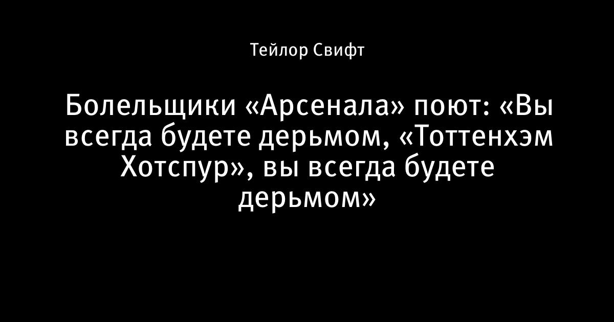 6 ноября 2016, 16:20 Болельщики «Арсенала» поют: «Вы всегда будете дерьмом, «Тоттенхэм Хотспур», вы всегда будете дерьмом» Автор Тейлор Свифт Этот пост опубликован в блоге на Трибуне Sports.ru. Присоединяйтесь к крупнейшему сообществу спортивных болельщиков! Другие посты блога Тейлор Свифт болельщики премьер-лига Англия Тоттенхэм Арсенал