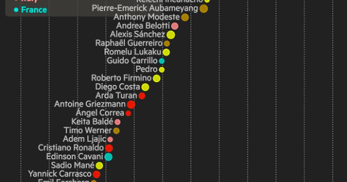 Размер кружка говорит о количестве сыгранных минут. Соответственно, чем больше минут сыграно, тем сложнее придерживаться высокой результативности. На графие отображены 40 самых результативных нападающих топ 5 лиг без учёта голов с 11-метровой отметки. Источник - Transfermarkt.