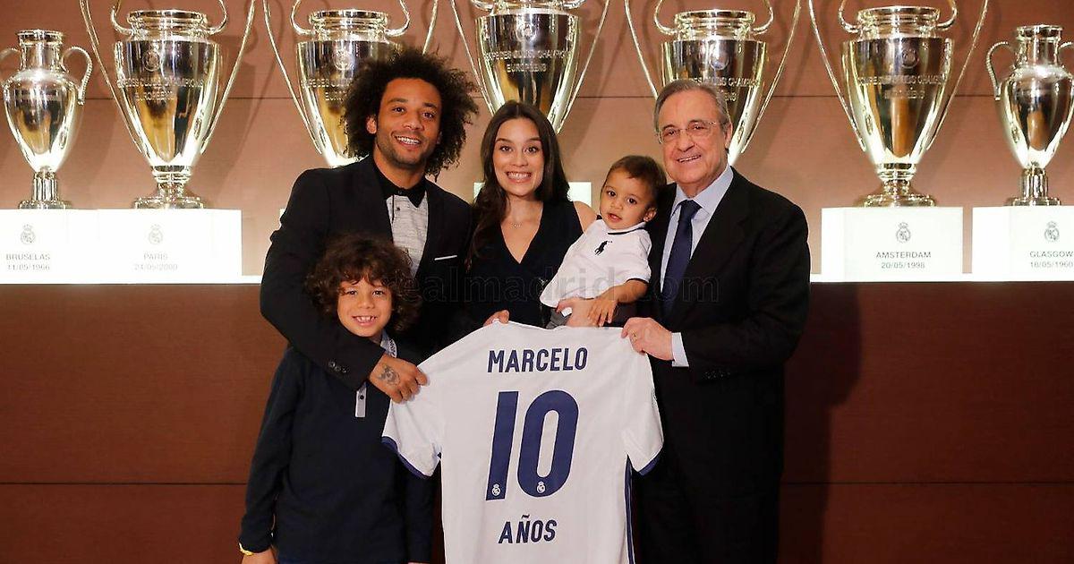 Флорентино Перес в честь 10-летия со дня подписания контракта с Марсело подарил бразильцу памятную футболку и часы.