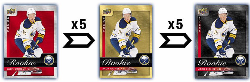 Сет из 200 виртуальных карт можно поменять на сет из 10 реальных. 5 реальных одинаковых карт на 1 аналогичную золотую параллель и 5 золотых параллелей на 1 черную. Для подсерий принцип тот же.