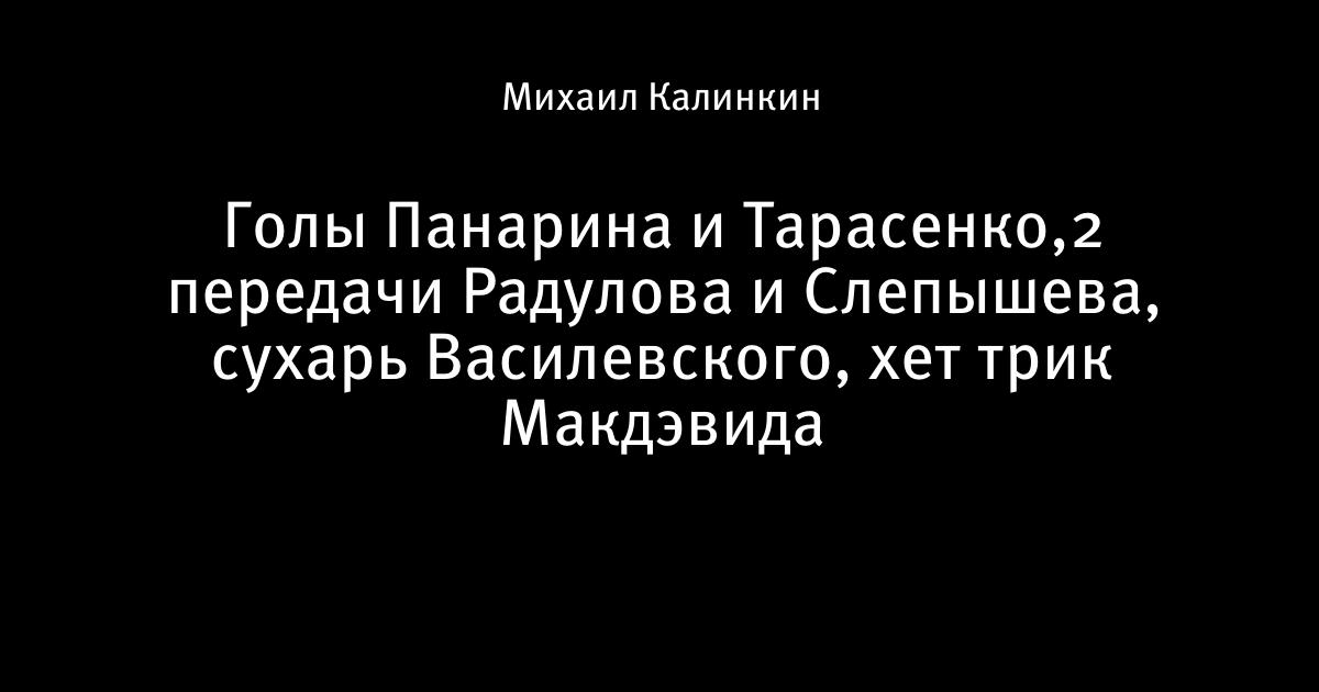 20 ноября 2016, 09:57 Голы Панарина и Тарасенко,2 передачи Радулова и Слепышева, сухарь Василевского, хет трик Макдэвида Автор Михаил Калинкин Этот пост опубликован в блоге на Трибуне Sports.ru. Присоединяйтесь к крупнейшему сообществу спортивных болельщиков! Другие посты блога Russian Legion