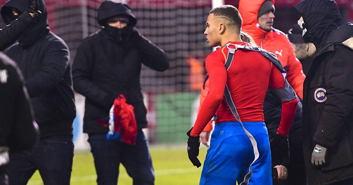Болельщики выбежали на поле после финального свистка и заставили снять игровую форму Джордана Ларссона.