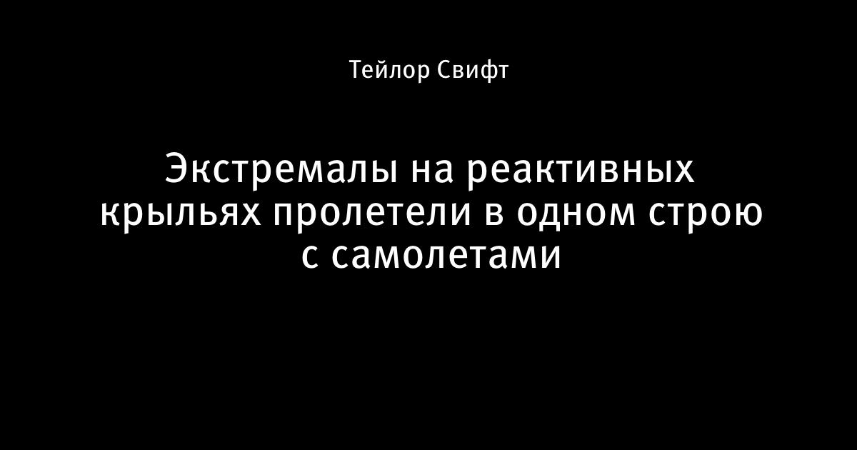 25 ноября 2016, 09:37 Экстремалы на реактивных крыльях пролетели в одном строю с самолетами Автор Тейлор Свифт Этот пост опубликован в блоге на Трибуне Sports.ru. Присоединяйтесь к крупнейшему сообществу спортивных болельщиков! Другие посты блога Тейлор Свифт