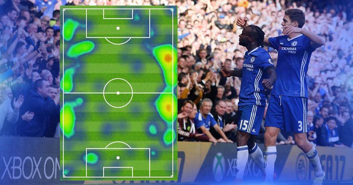 В обороне Мозес пока только учится аккуратной и дисциплинированной игре, но его статистика уже выглядит неплохо: 1,8 перехвата, 1,4 успешных отбора и 2,2 выноса в среднем за 90 минут. Виктор проигрывает другим видным винг-бэкам вроде Алекса Сандро и Дани Алвеса почти по всем показателям, но, во-первых, его недостатки отлично маскируют фантастические ребята вроде Канте, Матича и Аспиликуэты (Сезар совершает в два раза больше отборов, чем Кэйхилл, играющий под Алонсо), а, во-вторых, он выступает на этой позиции так недолго, что было бы глупо требовать от него таких же статистических показателей, как от опытных крайних защитников.
