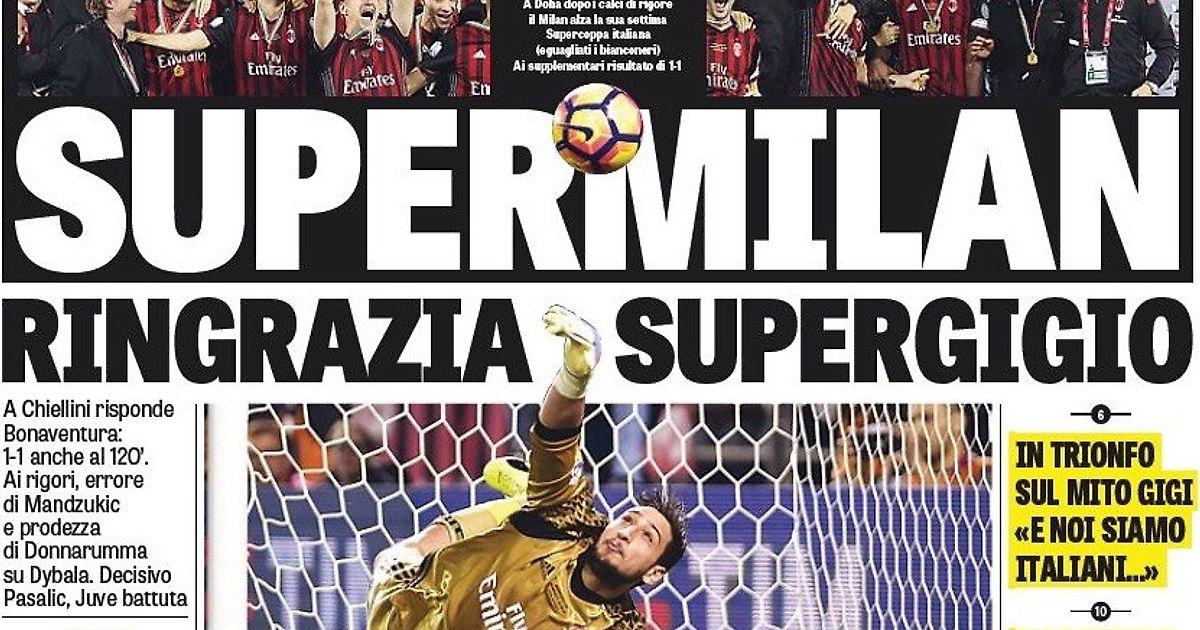 Суперкубок Италии, «Юве»-«Милан» 4:5. На гол Кьеллини ответил Бонавентура: 1:1 также после 120 минут. В серии пенальти ошибка Манджукича и подвиг Доннаруммы при ударе Дибалы. Всё решил Пашалич, «Юве» побеждён.