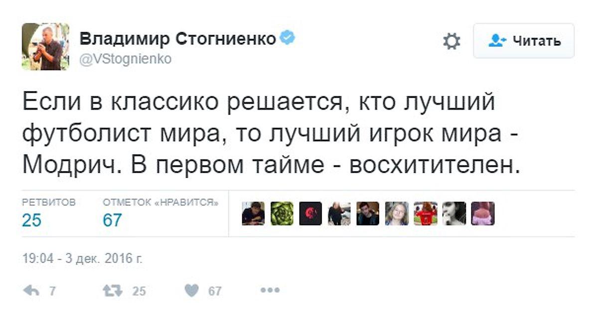 3 декабря 2016, 19:21 Твит Стогниенко о лучшем футболисте мира Автор Александр Фадин Реал Мадрид Барселона Ла Лига Владимир Стогниенко