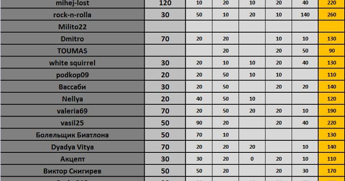 Добрый вечер! На этой неделе заработалась, но все рано стараюсь вовремя заносить результаты, поэтому есть ошибки. Если кто-то считатет, что это легкая работа, то еще раз предлагаю на следующем этапе попробовать свои силы не только в подсчетах, но и в расстановке прогнозистов по местам. Но что-то я не вижу желающих, так что ждите места после целого этапа.