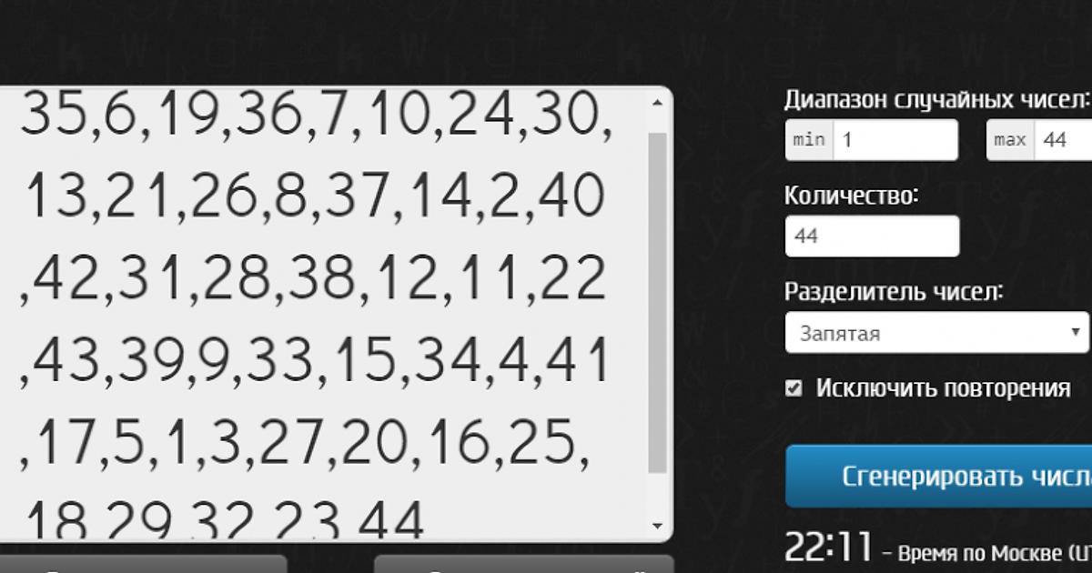 Жеребьевка команд при помощи сайта с программой генератор случайных чисел. Змейкой. Первый выпавший номер, а также 22-й, 23-й и 44-й - команда №1. Команда №2: 2-й выпавший номер, 21-й, 24-й и 43-й. И т.д.