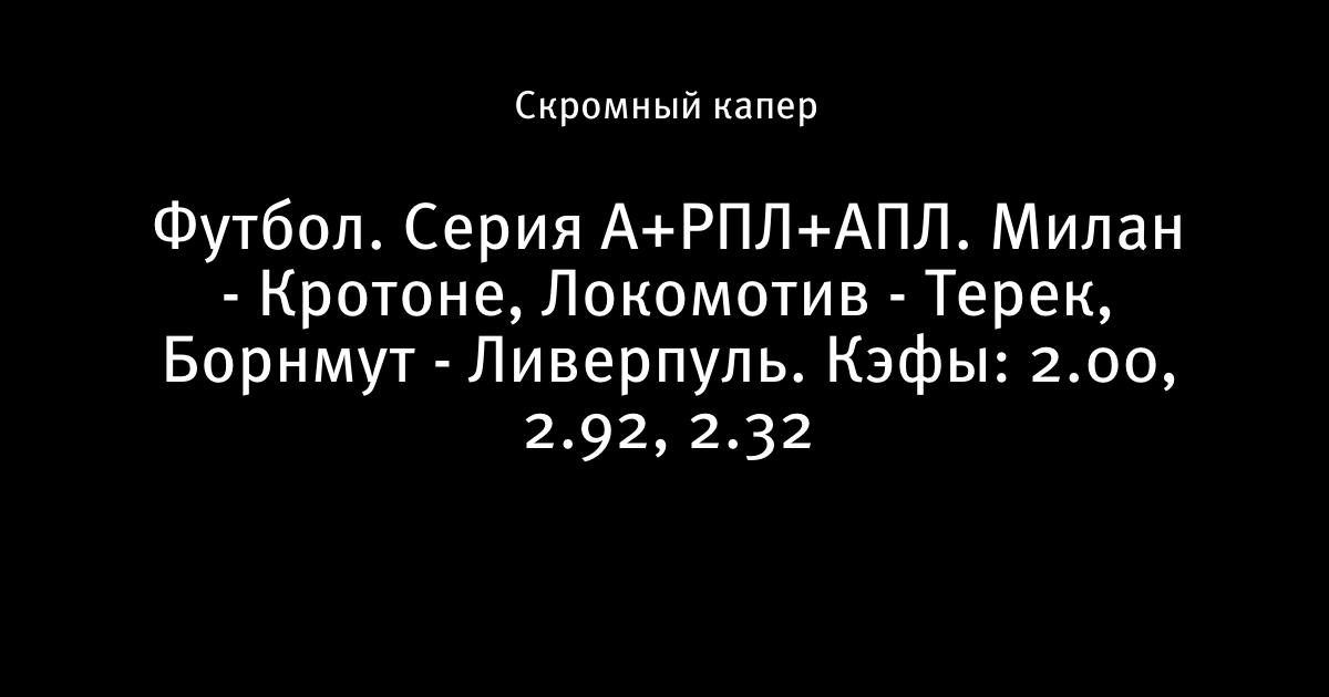 Футбол. Серия А+РПЛ+АПЛ. Милан - Кротоне, Локомотив - Терек, Борнмут - Ливерпуль. Кэфы: 2.00, 2.92, 2.32