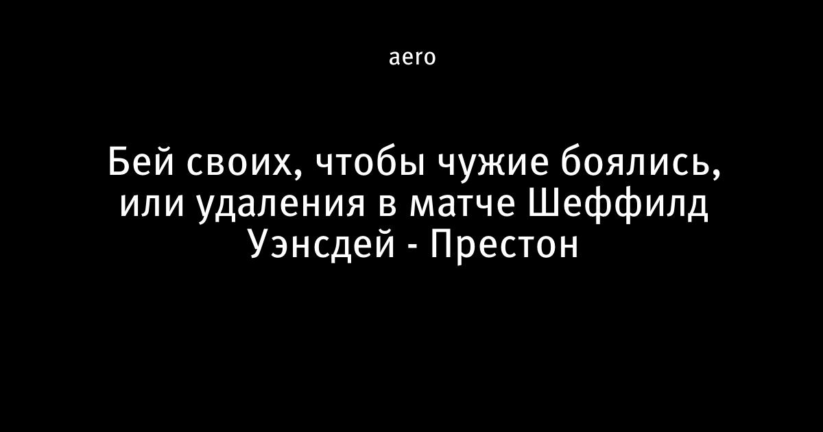 4 декабря 2016, 11:28 Бей своих, чтобы чужие боялись, или удаления в матче Шеффилд Уэнсдей - Престон Автор aero Этот пост опубликован в блоге на Трибуне Sports.ru. Присоединяйтесь к крупнейшему сообществу спортивных болельщиков! Другие посты блога Вы это видели? Шеффилд Уэнсдей Престон