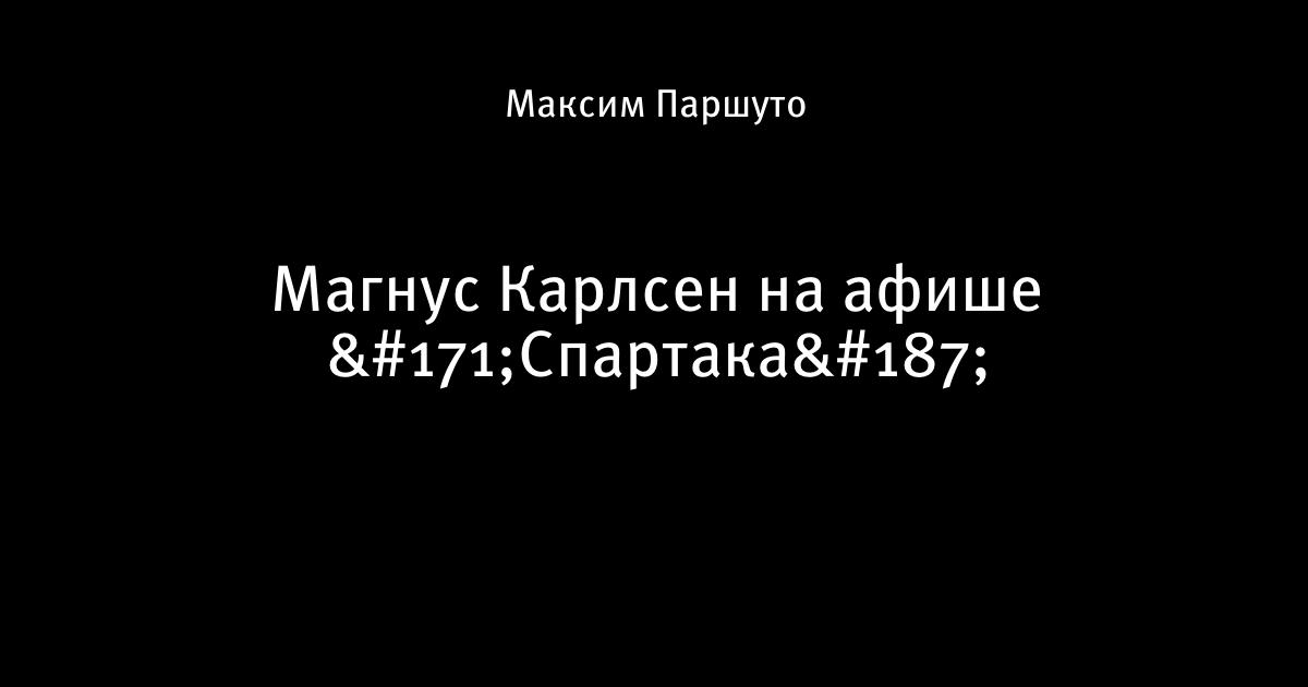 4 декабря 2016, 16:13 Магнус Карлсен на афише «Спартака» Источник: Facebook Спартака Автор Максим Паршуто Этот пост опубликован в блоге на Трибуне Sports.ru. Присоединяйтесь к крупнейшему сообществу спортивных болельщиков! Другие посты блога Телевизор 3.0 Магнус Карлсен Спартак