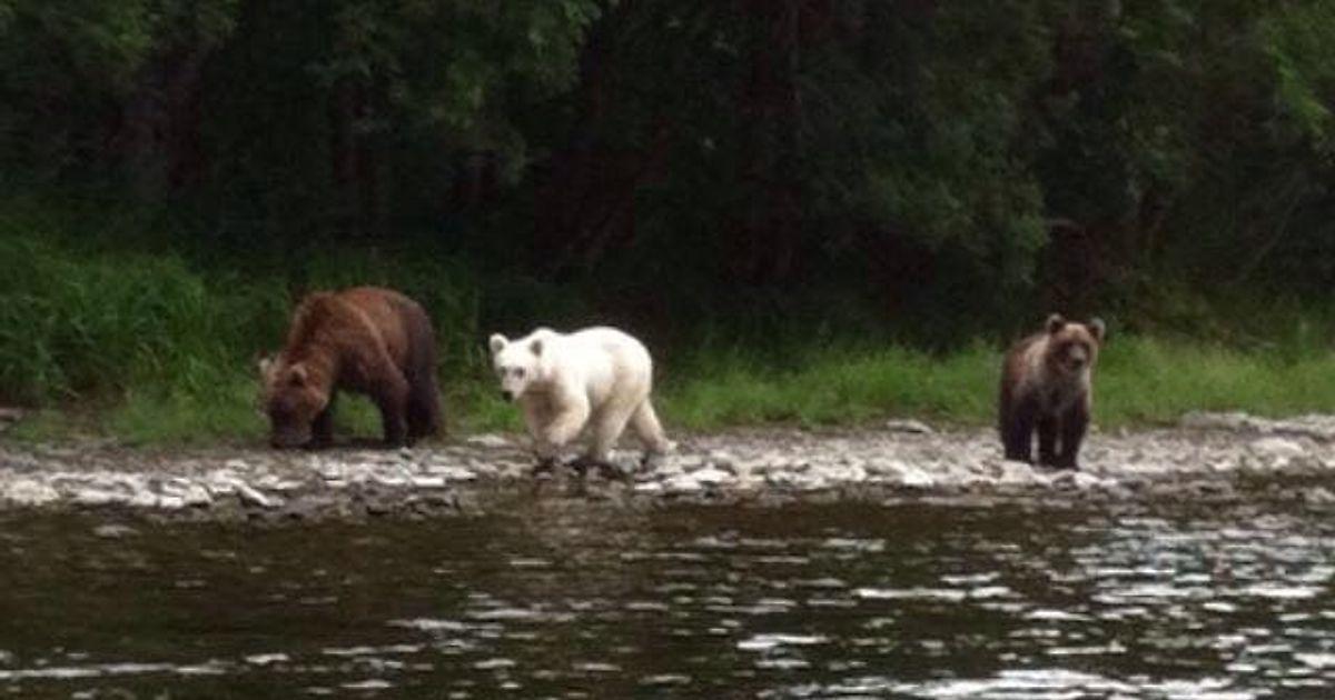 Необычайно светлый, почти белого цвета, бурый медведь был обнаружен туристами во время сплава по реке Быстрая Усть-Большерецкого района Камчатки. Путешественники успели заснять на камеры, как мать-медведица идёт по берегу в сопровождении двух медвежат, один из которых окрасом больше похож на полярного медведя. Учёные, увидевшие снимки, назвали животное уникальным.