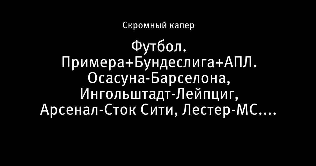 Футбол. Примера+Бундеслига+АПЛ. Осасуна-Барселона, Ингольштадт-Лейпциг, Арсенал-Сток Сити, Лестер-МС. Кэфы: 1.91-2.65
