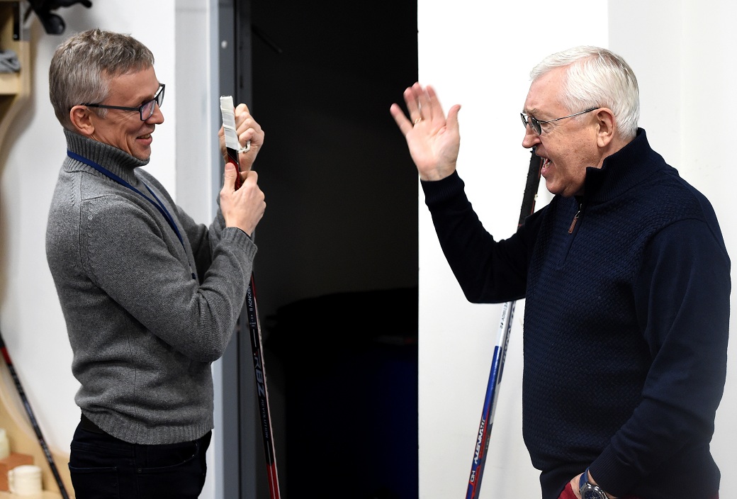 Вот рядом сидят Могильный и Буре, слева – Фёдоров. Вот Фетисов обстоятельно рассказывает о турнире, Зелепукин собирает автографы на игровой свитер, слышен громкий голос Коваленко. Кажется, большая часть истории нашего хоккея сейчас здесь.