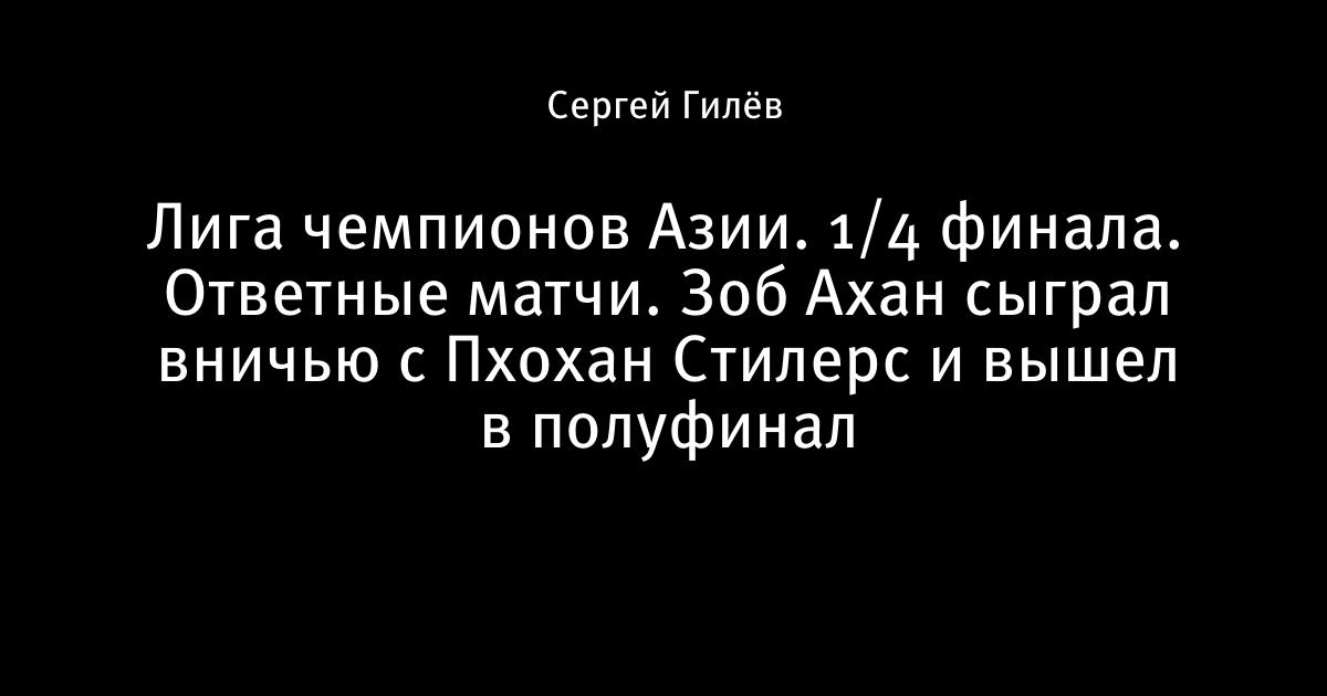 22 сентября 2010, 23:35 Лига чемпионов Азии. 1/4 финала. Ответные матчи. Зоб Ахан сыграл вничью с Пхохан Стилерс и вышел в полуфинал Самсунг Блювингс Южная Корея Соннам Ильва Чонма Южная Корея 2:0 (1:0, 1:0) Пхохан Стилерс Южная Корея Zobahan 1:1 (1:0, 0:1) Аль-Гаррафа Катар Аль-Хилаль Саудовская Аравия 4:2 (3:0, 0:0, 1:0) Аль-Щабаб Чонбук Хендай Моторс Южная Корея 0:1 (0:1, 0:0) Автор Сергей Гилёв Этот пост опубликован в блоге на Трибуне Sports.ru. Присоединяйтесь к крупнейшему сообществу спортивных болельщиков! Другие посты блога Разборки в олимпийском Париже