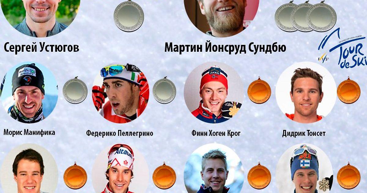 10 лыжников стояли на пьедестале по результатам 6 гонок. Сергей Устюгов (5 побед и 1 серебро), Мартин Йонсруд Сундбю (1 победа и 3 серебра), Федерико Пеллегрино (серебро в спринте), Морис Монифика (серебро в индивидуальной гонке), Финн Хоген Крог (бронза в спринте), Дидрик Тонсет (бронза в масс-старте), Дарио Колонья (бронза в скиатлоне), Алекс Харвей (бронза в гонке преследования), Симен Хегстад Крюгер (бронза в индивидуальной гонке), Матти Хейккинен (бронза в масс-старте).