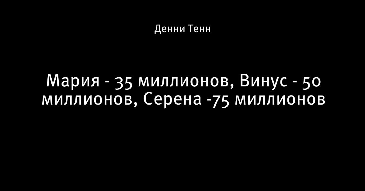 10 января 2017, 06:51 Мария - 35 миллионов, Винус - 50 миллионов, Серена -75 миллионов Видео Все 23 основных акционера UFC - сколько акций они имеют: > Автор Денни Тенн Этот пост опубликован в блоге на Трибуне Sports.ru. Присоединяйтесь к крупнейшему сообществу спортивных болельщиков! Другие посты блога Nasha Masha WTA