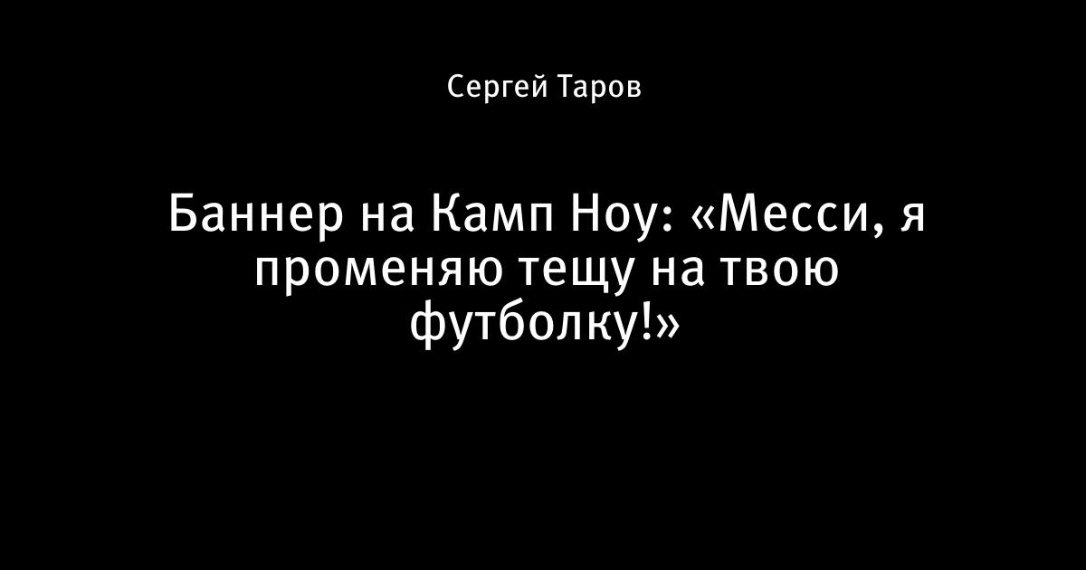 14 января 2017, 20:09 Баннер на Камп Ноу: «Месси, я променяю тещу на твою футболку!» Автор Сергей Таров Этот пост опубликован в блоге на Трибуне Sports.ru. Присоединяйтесь к крупнейшему сообществу спортивных болельщиков! Другие посты блога Barça Лионель Месси Барселона