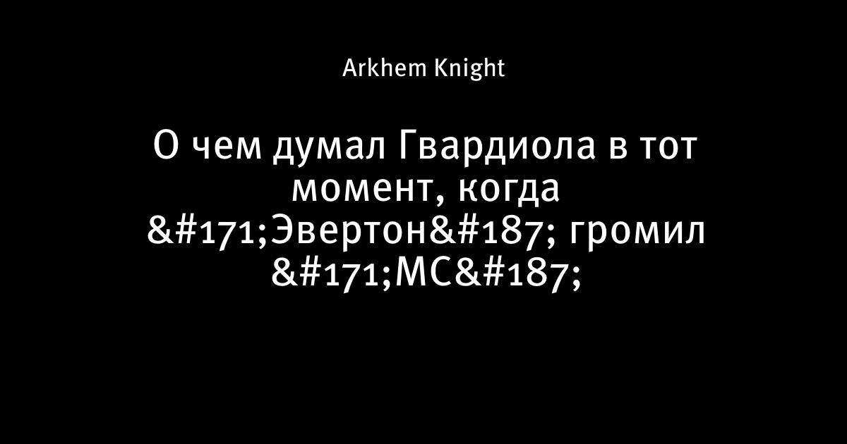 18 января 2017, 09:04 О чем думал Гвардиола в тот момент, когда «Эвертон» громил «МС» Бедный, бедный Пеп. Автор Arkhem Knight Этот пост опубликован в блоге на Трибуне Sports.ru. Присоединяйтесь к крупнейшему сообществу спортивных болельщиков! Другие посты блога Лечебница Аркхем Пеп Гвардиола