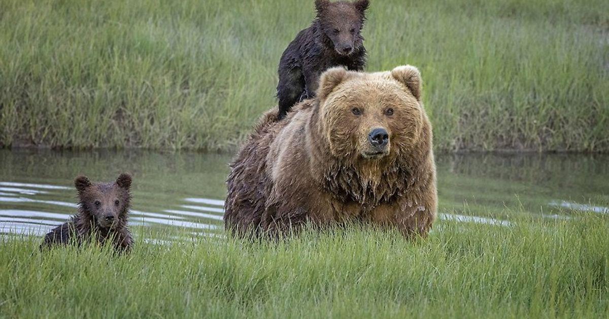 Австралийский фотограф Рене Дойл заснял в Национальном парке Кларк на Аляске интересную ситуацию с бурыми медведями, которые отправились за пищей. Медведица позволила своему испуганному медвежонку, не захотевшему переходить мелководье вброд, забраться к себе на спину и перевезла его на другую сторону реки.