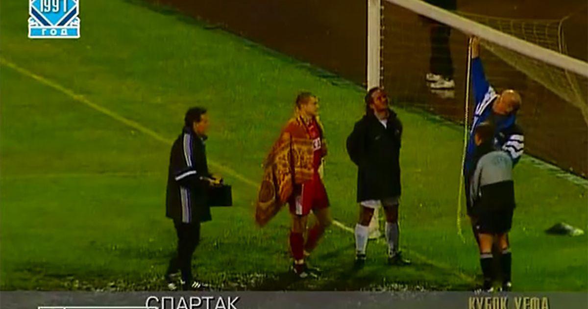 Кубок УЕФА-1997/98, швейцарский «Сьон» приехал играть со «Спартаком», но заметил редкое: высота ворот стадиона «Локомотив» не соответствует стандартам. Капитан «Спартака» Сергей Горлукович (в винтажном пледе) молчит, но вы догадываетесь, что и про кого он думает в эту секунду.
