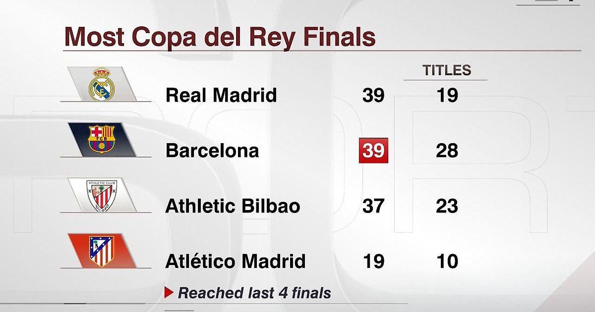 «Барселона» в 39-й раз вышла в финал Кубка Испании, сравнявшись по этому показателю с мадридским «Реалом», однако по количеству титулов у каталонцев неоспоримое преимущество — на пять больше, чем у ближайшего преследователя, «Атлетик Бильбао»