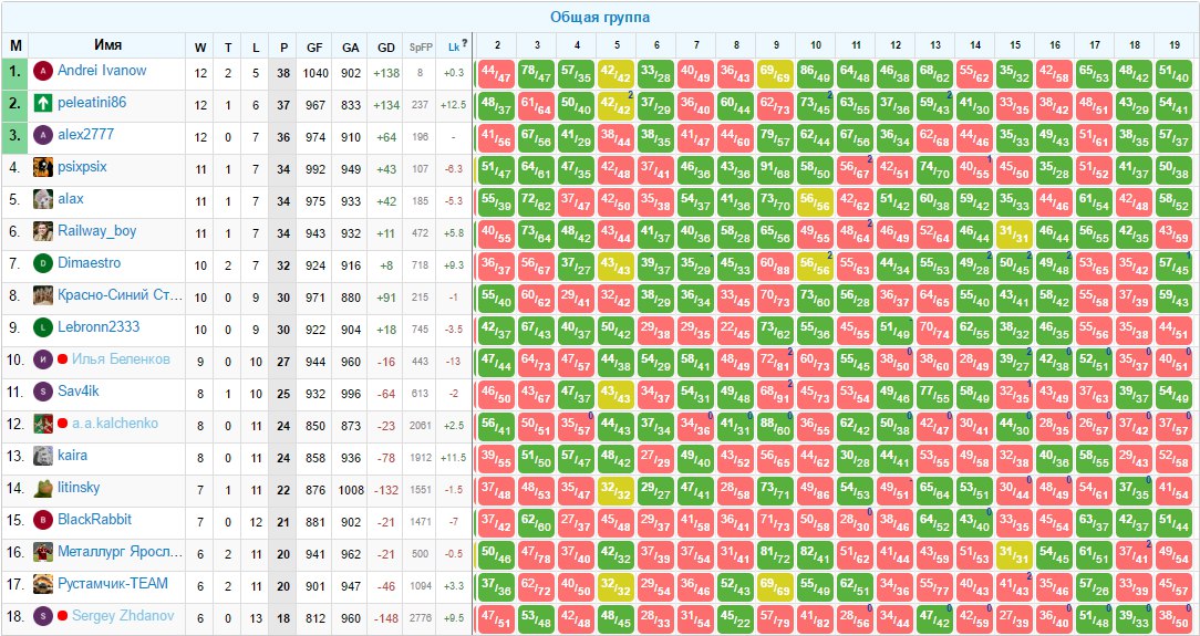 - после 18-го тура и в последующие туры из группы выбывают по 2 худших игрока:
