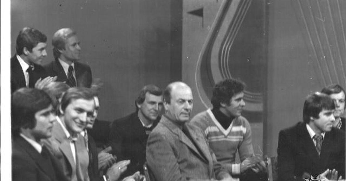 1981. МЕТАЛЛИСТ - ЧЕМПИОН СССР среди команд 1 Лиги. СПУСТЯ 19 лет ХАРЬКОВ ВНОВЬ ВОЗВРАЩАЕТСЯ в ВЫСШУЮ ЛИГУ СССР! Встреча по окончанию сезона на Харьк.ТВ. Слева направо. Стоят:ЛИНКЕ-ТКАЧЕНКО. Сидят:БАЧИАШВИЛИ-Крячко-(прикрыт Горбик)-Довбий-Лемешко-Сивуха-МАЛЬКО-ЦЫМБАЛЮК