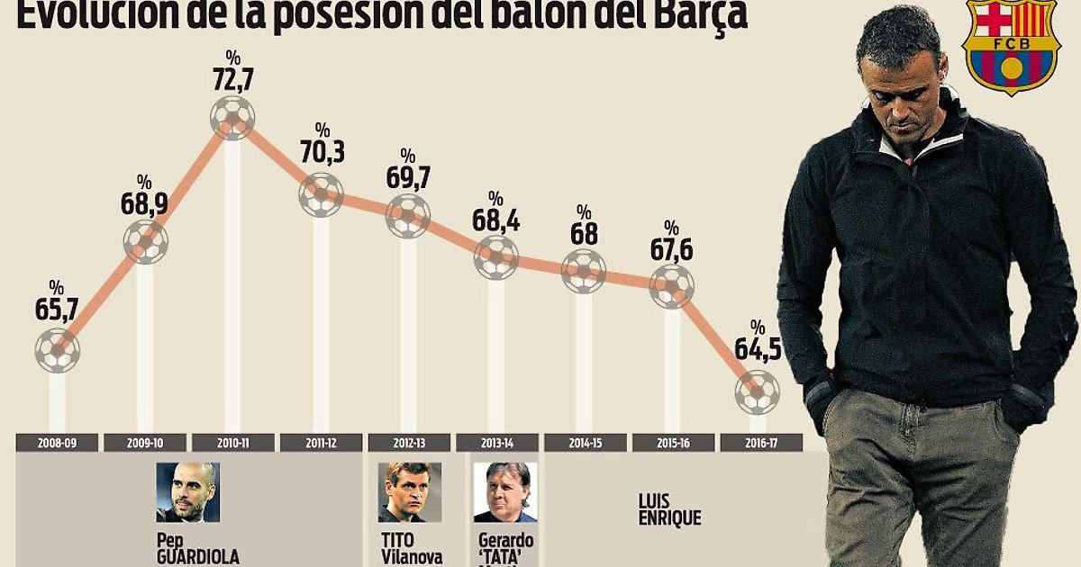 "Барселона" показывает худший средний показатель по владению мячом за последние 9 лет. В текущем сезоне подопечные Луиса Энрике в среднем владеют сферой 64,5% игрового времени.Примечательно, что этот показатель последовательно ухудшается на протяжении последних шести сезонов.