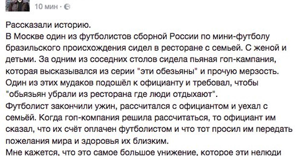 1 марта 2017, 08:49 Реакция на расизм, которая достойна уважения Источник: Facebook Evgenii Statsenko Автор Максим Паршуто Этот пост опубликован в блоге на Трибуне Sports.ru. Присоединяйтесь к крупнейшему сообществу спортивных болельщиков! Другие посты блога Телевизор 3.0 сборная России