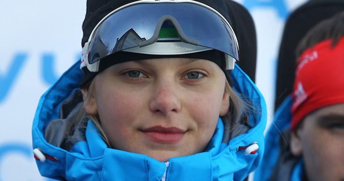 Евгения Клопотная, победитель смешанной эстафеты соревнований по биатлону VIII зимней Спартакиады учащихся России.