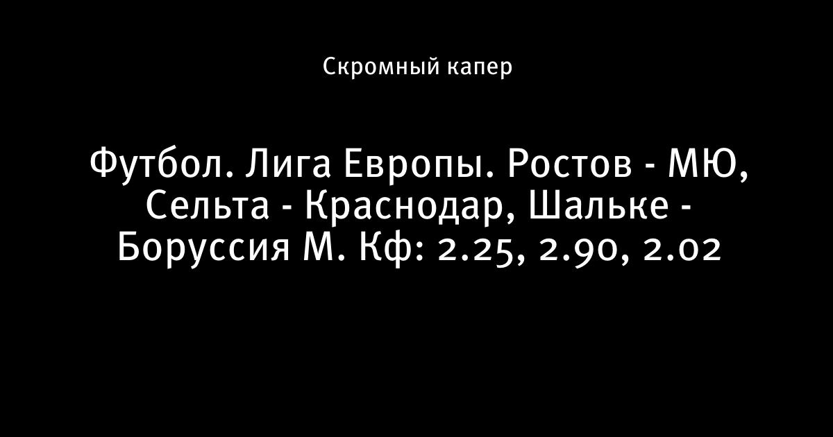 Футбол. Лига Европы. Ростов - МЮ, Сельта - Краснодар, Шальке - Боруссия М. Кф: 2.25, 2.90, 2.02