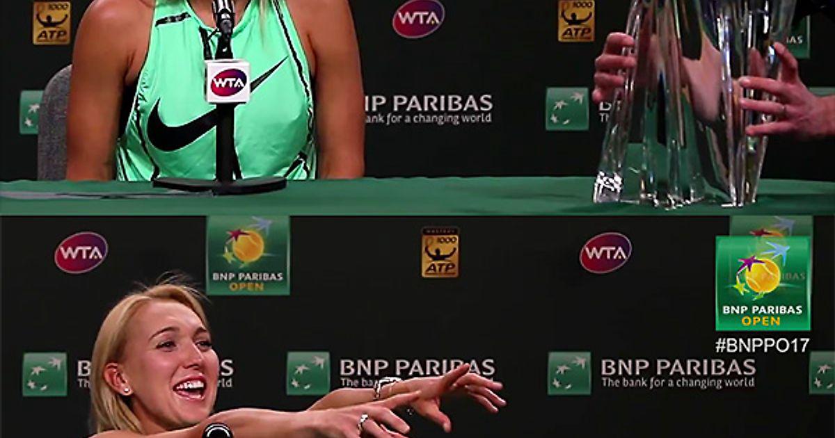 How does @EVesnina001 lose her #BNPPO17 🏆 midway through her champion’s press conference?