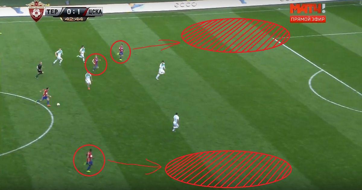 На картинке отчетливо видно, что за линией мяча находится 10 игроков "ЦСКА". Уциев снова не имеет много пространства и времени, поэтому он опять вынужден сделать передачу назад. В какую бы зону он не отдавал, то везде игроки "Терека" натыкались бы на двух оппонентов. Здесь виден почерк Гончеренко, который тоже самое делал в "Уфе" и "БАТЭ".