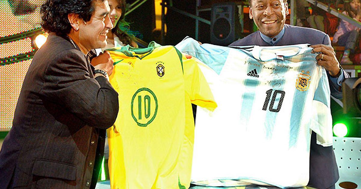 Первое великое противостояние двух футбольных гениев началось именно с Пеле и Марадоны. Удивительно, но друг друга они не застали. Пеле закончил в 77-ом, а Марадона только начинал 76-ом году. Тем не менее, многие до сих пор спорят кто же из них круче, а остроты добавляют и сами футболисты. Оба умеют сказать острое словцо на камеру, которое потом цитируют все популярные издания.
