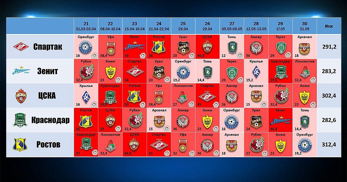 Графа "Итог" это общая сложность оставшихся игр, состоящая из слагаемых, посчитанных по следующему принципу: в случае домашнего матча прибавляется количество набранных очков соперником по результатам 20 туров, если же команда играет в гостях, то эти очки умножаются на условный коэффициент 1.2. Пример: Спартак в 22 туре едет в Уфу. Клуб из Башкортостана набрал за 20 игр - 32 очка, а так как для москвичей это гостевая встреча, то сложность ее будет рассчитана следующим образом 32*1,2=38,4