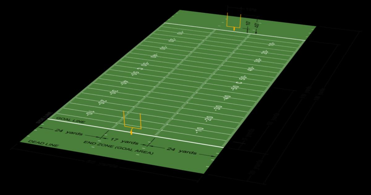 Поле: Длина: между двумя goal line 110 ярдов вместо 100. End zone 20 ярдов вместо 10. Ширина: 65 ярдов (195 футов=59.47м) вместо 53 1/3 ярдов (160 футов=48.80м). Внутренние линии (засечки) - в 24 ярдах (72 футах=21.95м) от боковой линии вместо 23 7/12 ярдов (70 футов 9 дюймов=21.56м). Расстояние между внутренними линиями - 17 ярдов (51 фут=15.55м) вместо 6 1/6 ярдов (18 футов 6 дюймов=5.64м). Ворота по размеру идентичные, но в КФ они располагаются на goal line вместо dead line в АФ.