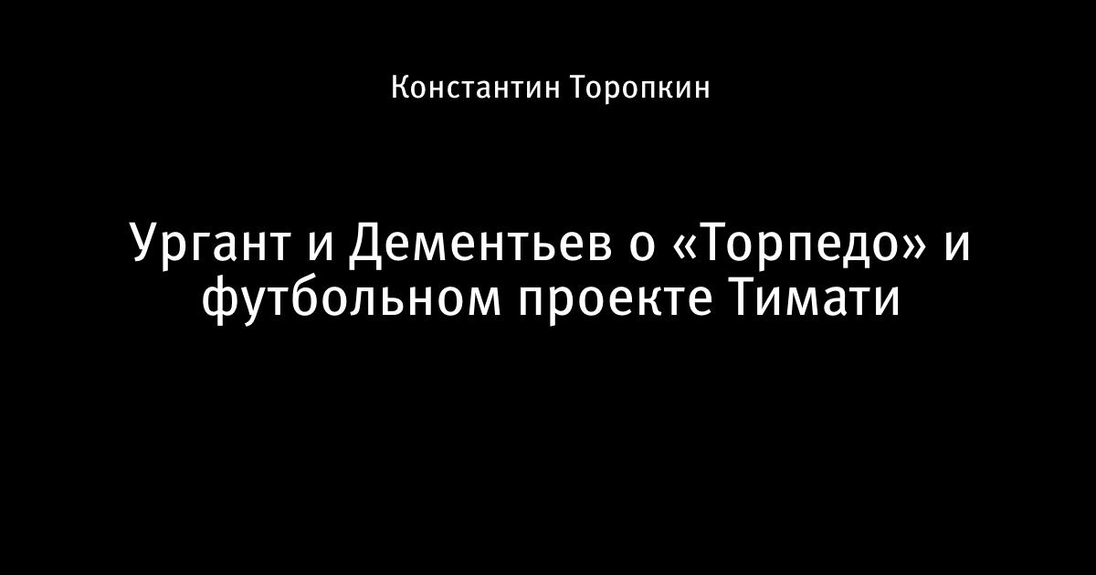31 марта 2017, 11:01 Ургант и Дементьев о «Торпедо» и футбольном проекте Тимати Автор Константин Торопкин Этот пост опубликован в блоге на Трибуне Sports.ru. Присоединяйтесь к крупнейшему сообществу спортивных болельщиков! Другие посты блога Torpedo News болельщики Торпедо Кирилл Дементьев ПФЛ Россия премьер-лига Россия видео