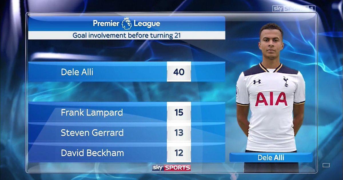 К своему 21 году Алли принял участие в 40 забитых мячах в АПЛ - 26 голов и 14 ассистов за два сезона. Это лучший показатель не только в сравнении с англичанами, Лэмпардом, Джерардом и Бэкхэмом, но и с Криштиано Роналдо. Португалец к 21 году поучаствовал в 25 мячах в АПЛ (14 голов, 11 ассистов).