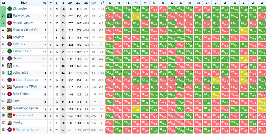 - после 18-го тура и в последующие туры из группы выбывают по 2 худших игрока: