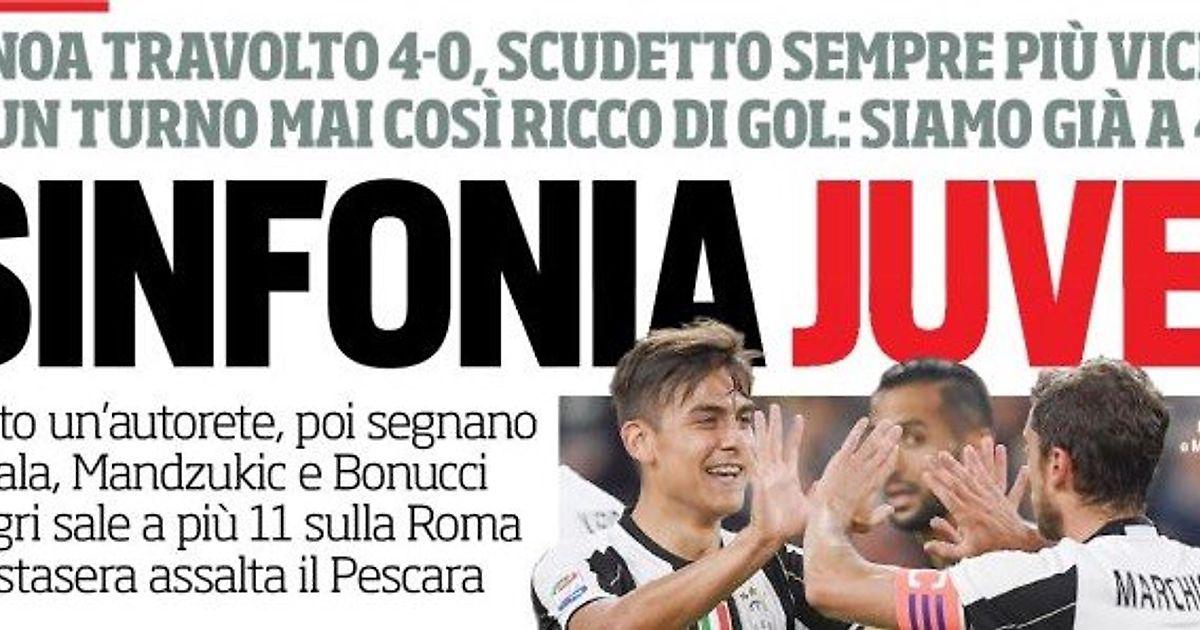 «Дженоа» повержена 4:0, Скудетто всё ближе. За один тур никогда не было так много голов: у нас уже 43. Сразу автогол, затем забили Дибала, Манджукич и Бонуччи. Аллегри поднимается на 11 очков над «Ромой», которая сегодня вечером штурмует «Пескару».